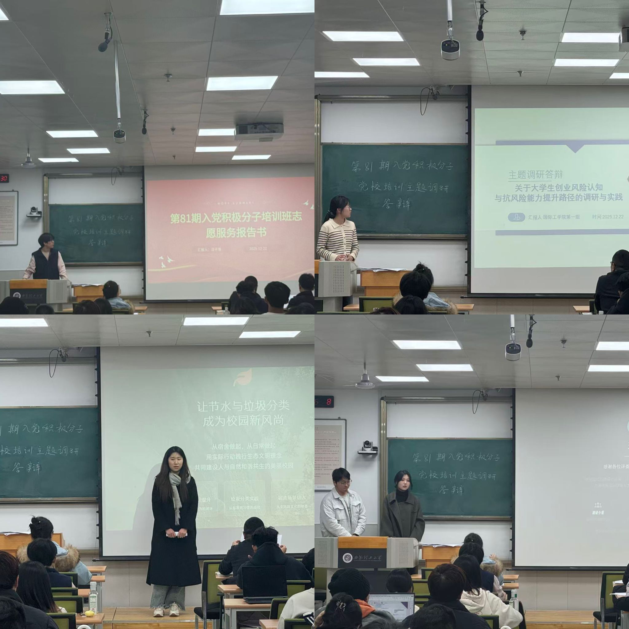 答辩过程中,各小组围绕“新时代背景下老员工的使命担当”“学风建设与创新精神培养”“老员工就业及创业问题”等主题,结合专业特色与个人思考,以“小切口、深调研”的方式展开汇报。学员们通过实地走访、问卷调查、访谈座谈等形式,收集第一手资料,从问题提出、方法设计、数据分析到对策建议,系统展示了调研全过程及实践感悟。部分小组还分享了在社区服务、企业参访、科研助困等志愿服务活动中的经历与体会,生动展现了入党积极分子的社会责任感和奉献精神。