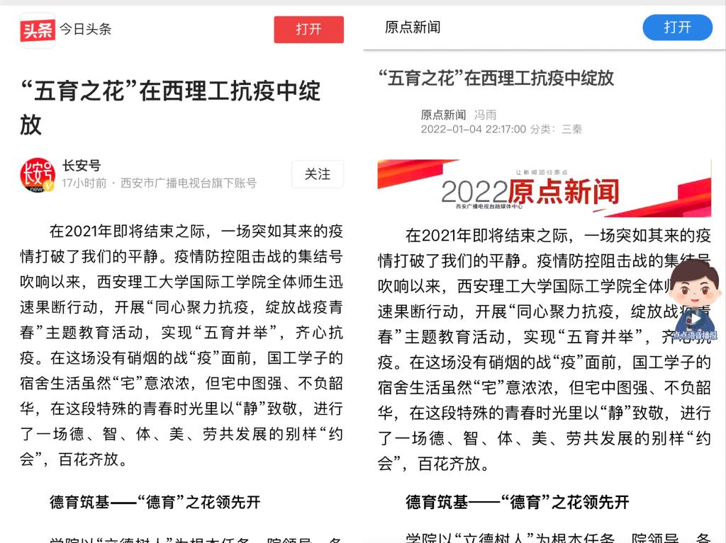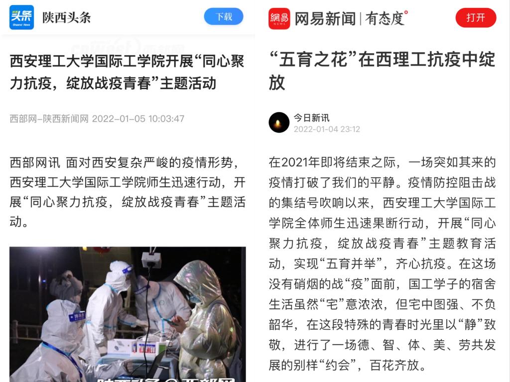 “同心聚力抗疫,绽放战疫青春”主题教育活动自开展以来,公司五育并举、齐心抗疫的事迹先后被学习强国平台、人民日报、原点新闻、今日头条、陕西头条、网易新闻等多家媒体平台转发。