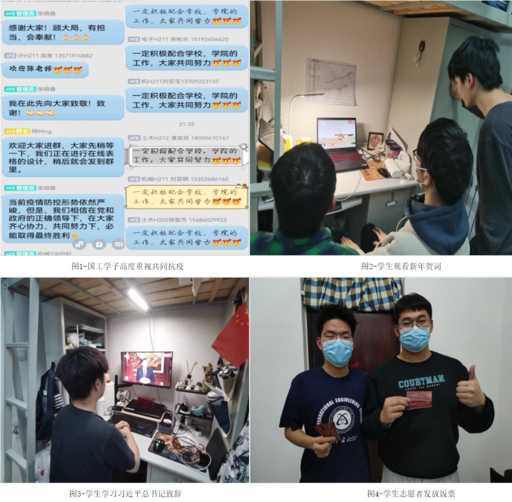 公司以“立德树人”为根本任务,院领导、各班导师、辅导员和全体师生通过“云班会”等线上团日活动的形式,认真聆听习近平总书记的新春贺词,主动学习和宣传疫情防控知识,明辨是非,培养员工规则意识;并从全面抗击疫情工作中分享“让我致敬的榜样”“最感动的瞬间”,为西安加油,为中国加油,增强在抗击疫情中的责任与担当;同时,“公司志愿者突击队”一经发出,许许多多的国工学子纷纷积极加入到抗疫行动志愿突击队中,没有丝毫胆怯和退缩,协助核酸检测,带上防护面罩,众志成城,挺身而出,奋勇当先,全身心为大家服务,树立必胜的信心。
